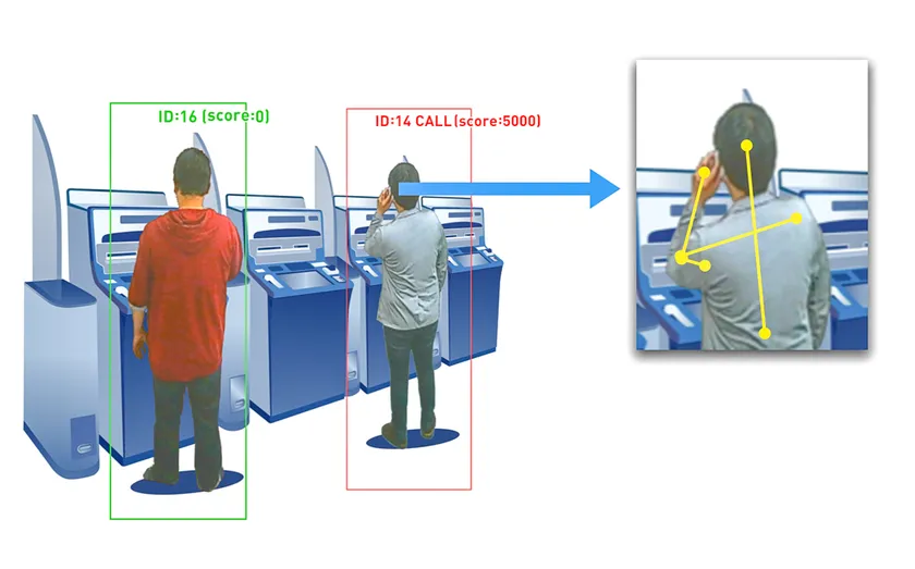 令和元年のオレオレ詐欺の被害額は111.6億円、還付金詐欺は30.1億円で、1日あたり3,882万円にも上る大きな社会問題です。(注)こうした社会課題をテクノロジーで解決するための試みとして、本実証では、ATMの前で電話をかけている姿勢を骨格推定で検出し、銀行内の職員にパトランプで通知します。職員が状況に応じて適切なお声がけを行うことで、振り込め詐欺を未然に防ぐものです。