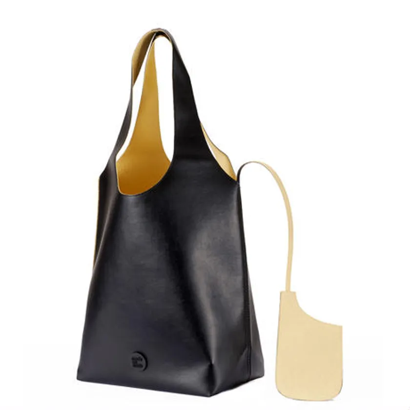持ち手根元部分を丸みを持たせたカッティングになっているので、よりアームホールに沿ったイメージです。またマチを5cm広げて底面がしっかりしたため収納性がアップしました。