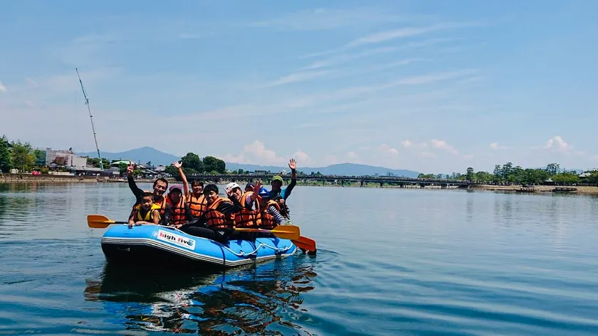 京都駅から快速で20分、JR亀岡駅より徒歩10分とアクセスも抜群。全長16kmの保津川をみんなと協力しながら下っていきます。途中には、落差2mの激流を突破したり、岩場からの飛び込みなども楽しめます。