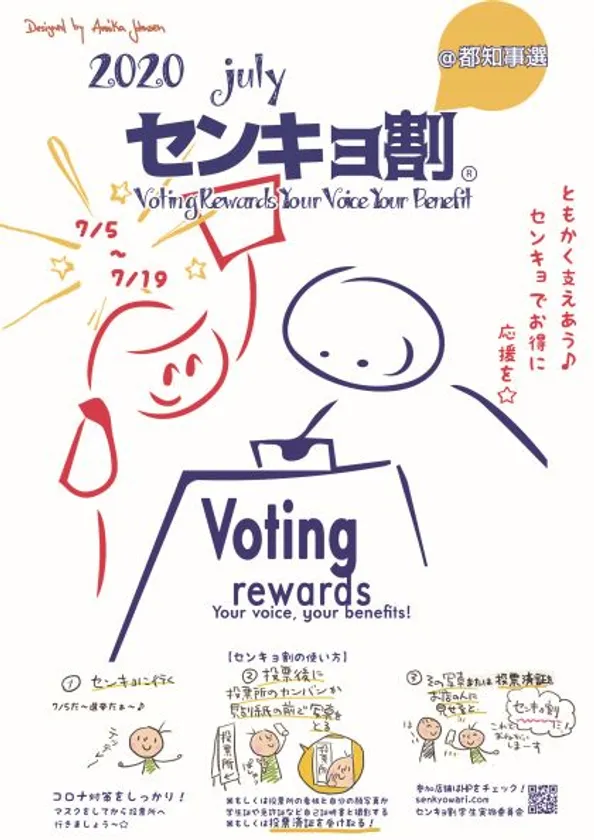 本企画は、若者が投票に行かず、政治に無関心である事に問題意識を持ち2012年より株式会社ワカゾウ主催で開始、昨年7月の参院選では47都道府県2,500前後のお店・企業が参加。PRアワードグランプリ2013年ソーシャルコミュニケーション部門最優秀賞を受賞し、社会科の教科書にも掲載、また小学校などで主権者教育にも導入されるなど、ある一定の社会的認知は確保してきました。センキョ割(選挙割・せんきょ割)、投票割の商標権運営権は一般社団法人選挙割協会が保持し、完全なボランティア有志のセンキョ割学生実施委員会にその運営権を委託しています。商標は営利目的でなく、あくまで公職選挙法遵守を徹底するため、法的拘束力を確保することを目的に、獲得・運用しております。「センキョ割@都知事選」の現状は(6月27日現在)160店舗に協力を頂いております。但しコロナの影響で準備が6月2週目前後から開始したため、またコロナだからこそ逆に参加企業様も増え、対応に追われており、例年の250前後の参加店舗数を大幅に上回りそうで対応に追われているのが正直な現状です。広報に関しては、ホームページや各SNS、学生によるビラ配りなどの宣伝を行っております。また都知事選に合わせ、学生団体ivoteの協力も得て、第3回目となる大規模な政治意識アンケート調査も実施(首都圏の大学生、高校や小学校まで学校単位で賛同いただき、大学教授なども多く賛同いただき、5日前後に集計結果をHP上で発表いたします。)また7月3日金曜15時から18時に下北沢(しもきたまりーば)で熱中症対策を試みるNPO団体カエルプロダクションと、かき氷店を出店、コロナ対策を意識し学生がビラを配り宣伝する予定です(雨天中止)。