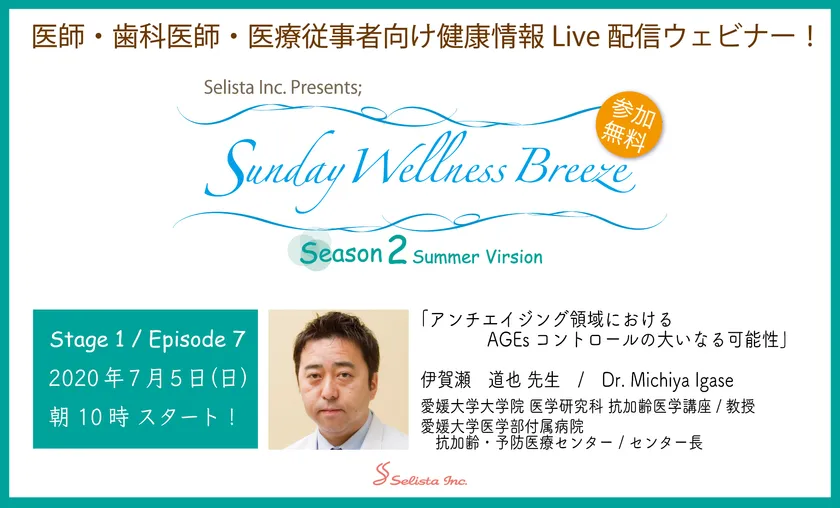 セリスタ株式会社(東京都千代田区、代表取締役:伊藤 承正)は、2020年7月5日(日)朝10時から、愛媛大学大学院医学研究科抗加齢医学講座教授の伊賀瀬 道也先生による「アンチエイジング領域におけるAGEs(終末糖化産物)コントロールの大いなる可能性」と題した医師・歯科医師・薬剤師・医療従事者向けの無料Live配信ウェビナーを開催します。