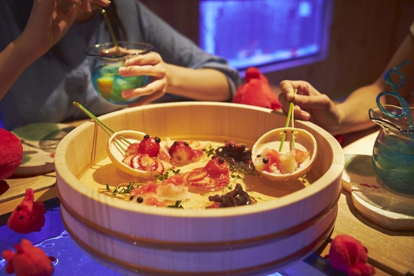 江戸時代、モナカの皮に針金で持ち手を付けた道具「ポイ」を使用して金魚すくいをしていました。スイーツの皿をその道具にみたて、餡やいちごで作られた金魚をすくい、食べることができます。他にも金魚型のクッキーやカクテルを提供します。