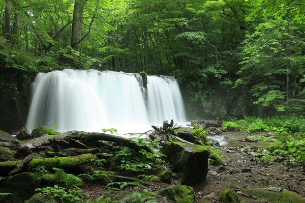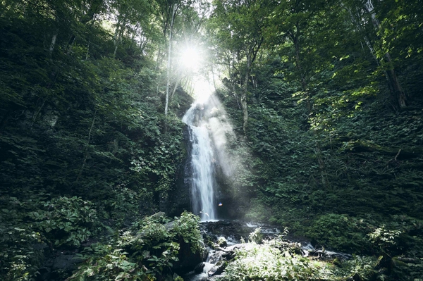 奥入瀬渓流は、U字型の渓谷になっており、バスが走る車道や遊歩道はその谷底にあります。そのため、車道や遊歩道を進んでいくと、背の高い樹木や岩壁に覆われ、まるで森のトンネルを進んでいるようです。森の木々は、高さ約30メートル以上になるものも多く、それらの木々に芽吹かせた葉が傘となり、真夏の日差しや雨からも守ってくれます。たとえ雨が降ったとしても、ツアー参加者には無料でレインコートを配布するので、安心して、雨に濡れたしっとりと輝く森を楽しむこともできます。天候や季節によって様々な姿を見せてくれるのも、奥入瀬渓流の魅力です。