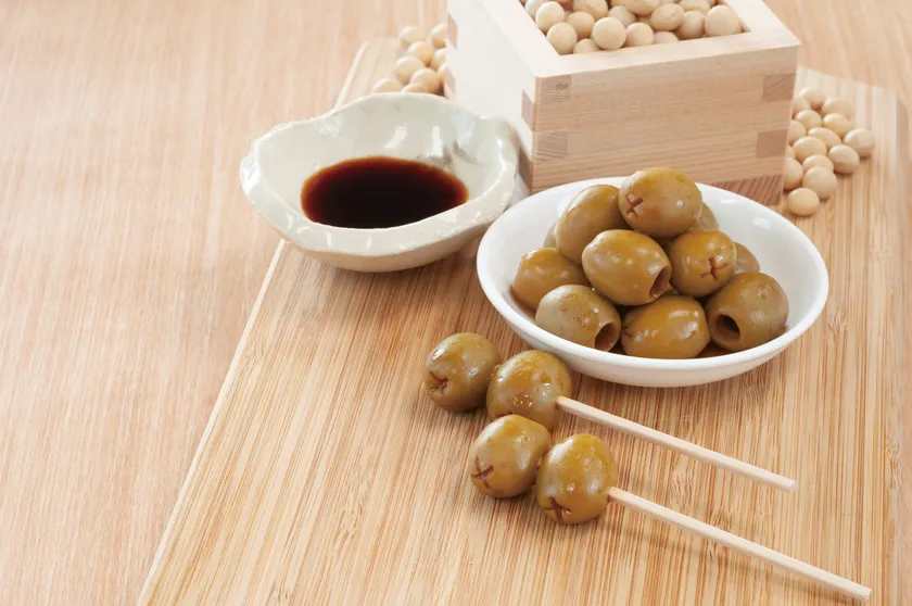 黒たまりオリーブは、香り高く深い味わいの再仕込み醤油や、甘味と深い旨味のある黒糖を使った漬け液に、昆布だしや山椒の香りを加えて漬け込みました。再仕込み醤油と黒糖で黒く染まったオリーブの実は、醤油とオリーブが融合した「和」の味わいへと生まれ変わりました。
