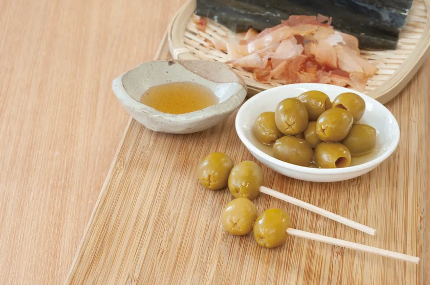 白だしオリーブは、風味豊かなかつおだしと上品な旨みが特徴の利尻昆布だしの2種類のダシを合わせた白だしの液にオリーブを漬けて、オリーブとだしの旨みが引き立つあっさりとした味わいに仕上げました。白だしに漬けたオリーブの実は、だしとオリーブが融合した「和」の味わいへと生まれ変わりました。