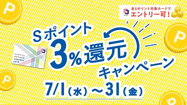7/1(水)~31(金)の期間に特設ページへエントリーいただき、阪急阪神グループの本キャンペーン対象ショッピングセンターでSポイント対象カードをご提示のうえ合計50,000円(税込)以上ご利用いただくと、通常ポイント+ご利用金額3%分のポイントをもれなく進呈!