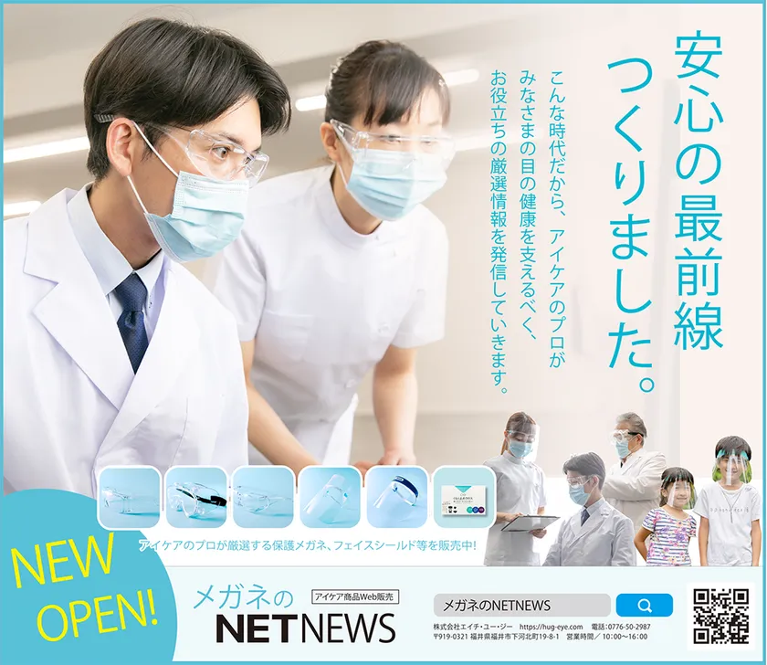 このたび7月1日のサイトのOPENに合わせて、地元誌の福井新聞で告知の記事広告を掲載して情報を配信しております。また、メガネのくもり止めなどマスクによるストレスを軽減する商品や大切なお子様を守る子供用フェイスガードなど様々なアイケアグッズを扱っております。