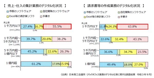人手不足や市場縮小に対応するために、中小企業の生産性向上は不可欠であり、その鍵はデジタル活用です。当所が実施した調査でも、業務プロセスの効率化や営業力の強化といった経営課題について、IT投資により解決を望む事業者が多いことが分かりました。 また、今年10月から導入される消費税インボイス制度へ的確に対応するには、バックオフィス業務のデジタル化が求められていますが、小規模の事業者の半数以上で、デジタル化が進んでいない状況です。
