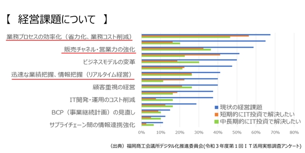 福岡商工会議所では、これまで、所内登録専門家と連携して中小企業のWeb・SNSを活用した販路開拓やクラウド会計の導入によるバックオフィス業務のデジタル化を支援してきました。今後、生産性向上につながるバックオフィス業務のデジタル化を推進していくためには、企業の経営課題を把握したうえで、身の丈に合ったツール選定を支援していくことが必要です。