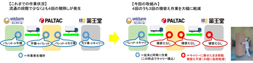 当業界における流通過程(メーカー(製)→中間流通・卸(配)→小売業(販))において、商品の移動にパレットやカゴ車、キャリーなど異なる種類の什器を使用するのが通例となっております。今回の取組みは、製・配・販の相互協力により、異なる種類の什器に代えて一貫して「キャリー」を活用することにより、配送効率化とともに、流通過程の各所で発生していた積替えなどの作業回数を減らし、作業者・ドライバーの負担軽減と労働時間の減少(従来比 約60%減)を実現し、サプライチェーン全体の最適化・効率化を図ることができました。また同時に、働き方改革やホワイト物流の推進などにも繋がり、持続可能な社会に向けた、SDGsの達成にも貢献していると考えております。