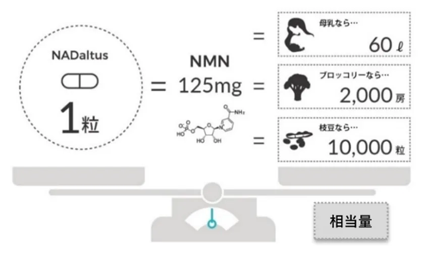 NMNは、加齢により体内での生成量が減少していく生体内物質NADの前駆体です。NMNは、母乳や枝豆、アボカド、緑黄色野菜に微量に含まれていますが、食事から十分な量を摂取するには、かなりの量が必要です。例えば、NADaltus1粒に含まれているのと同量である125mgのNMNを摂取するには、ブロッコリーなら2,000房、枝豆なら1万粒、母乳なら60L相当が必要となります。