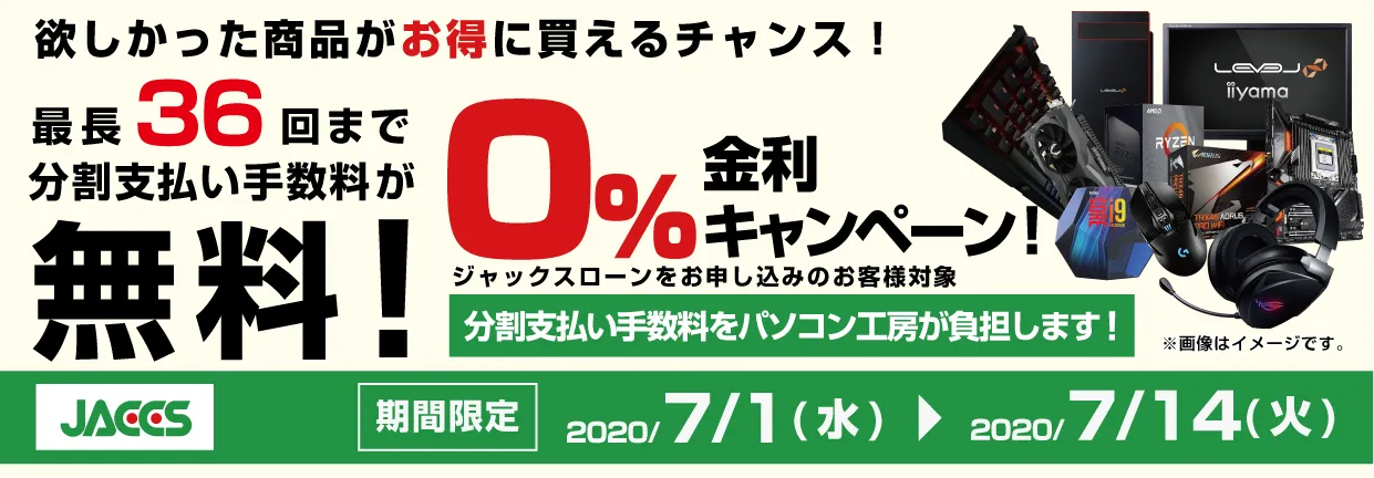 パソコン工房・グッドウィルを運営する株式会社ユニットコム(代表取締役:端田 泰三、本社:大阪市浪速区)は、パソコン工房 Web サイトおよび全国のパソコン工房・グッドウィル各店舗にて、ジャックスショッピングローンをご利用の場合、分割支払い金利手数料が最長 36 回まで無料になる『ショッピングローン 0%金利キャンペーン』を 2020 年 7 月 1 日(水)より開始しました。