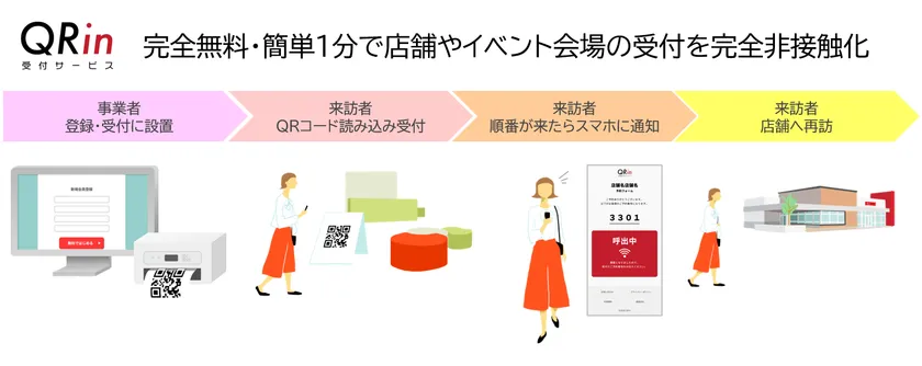 QRinを導入する店舗・企業は、ホームページ( https://qrin.jp/ )から必要事項を入力し、QRコードを出力して、受付スペースに設置すれば完了です。店舗・イベントを利用する来訪者は、受付のQRコードを自身のスマートフォンで読み込むだけで受付が完了します。あとは順番が来たらスマートフォンで通知を受けて再訪します。席数が少ない、予約でいっぱいなど満席を理由にお断りしている店舗でも、QRinで受付をしてもらうことで席が準備でき次第ご案内ができるため、満席による機会損失を防ぐことが可能です。