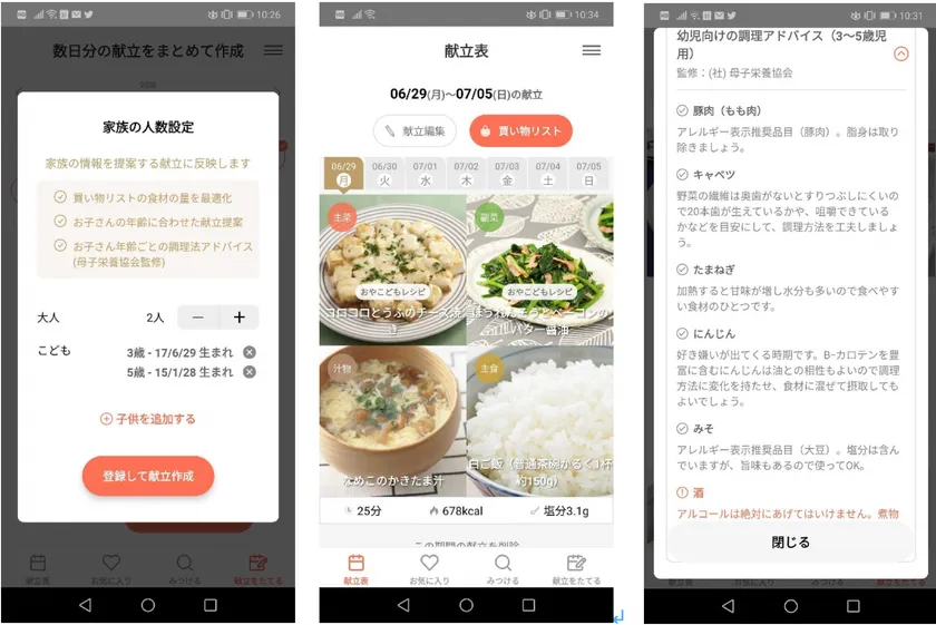 大人の数、こどもの年齢を入力することで最適な「おとなこども献立」をAIで提案(1週間分を表示可能)