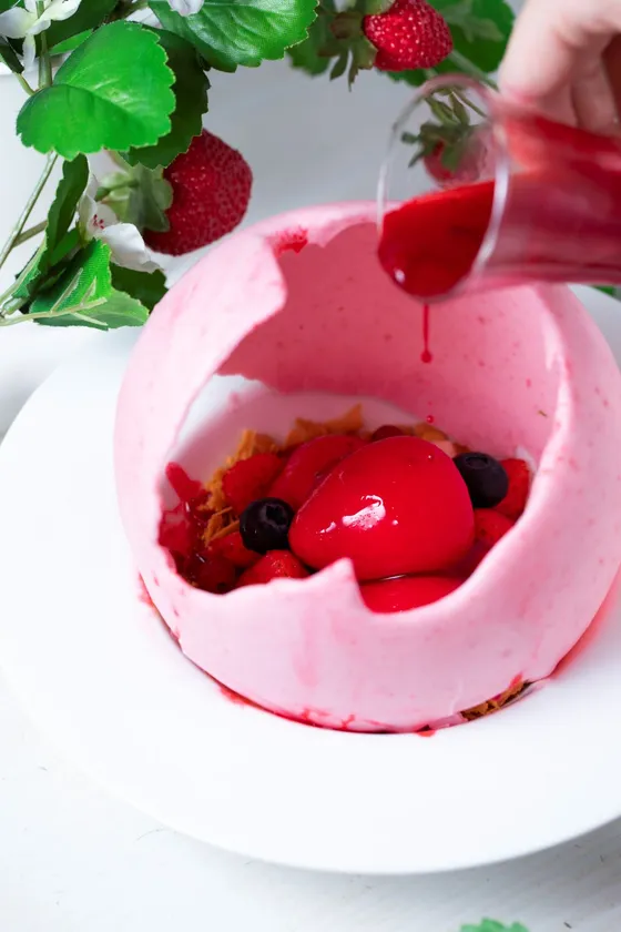 そこに温かいいちごのソースをかけることで、チョコレートが溶け出し、中からぷるんぷるんのミニいちごババロア、グロセイユ、サクサククレープ生地、生のいちごがお目見えします。