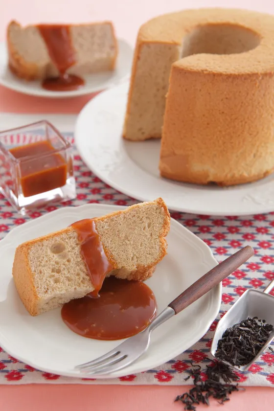 生地にロイヤルミルクティーを使用した香り豊かなシフォンケーキです。手作りのほろ苦いキャラメルクリームが紅茶の風味を引き立てます。シフォンケーキの作り方・メレンゲの泡立て方やキャラメルクリームの作り方などが学べます。