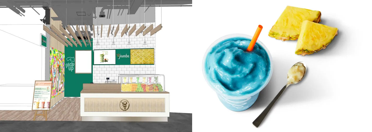 さらに店舗は、ビタミンカラーが目を惹くカラフルなミューラル(壁画)が特徴のデザインで、ご来店いただくお客様を明るい気持ちにさせてくれます。Jambaのスムージーを通して、ポジティブで元気でカラフルなライフスタイル“Jambaのある生活”をお楽しみください。