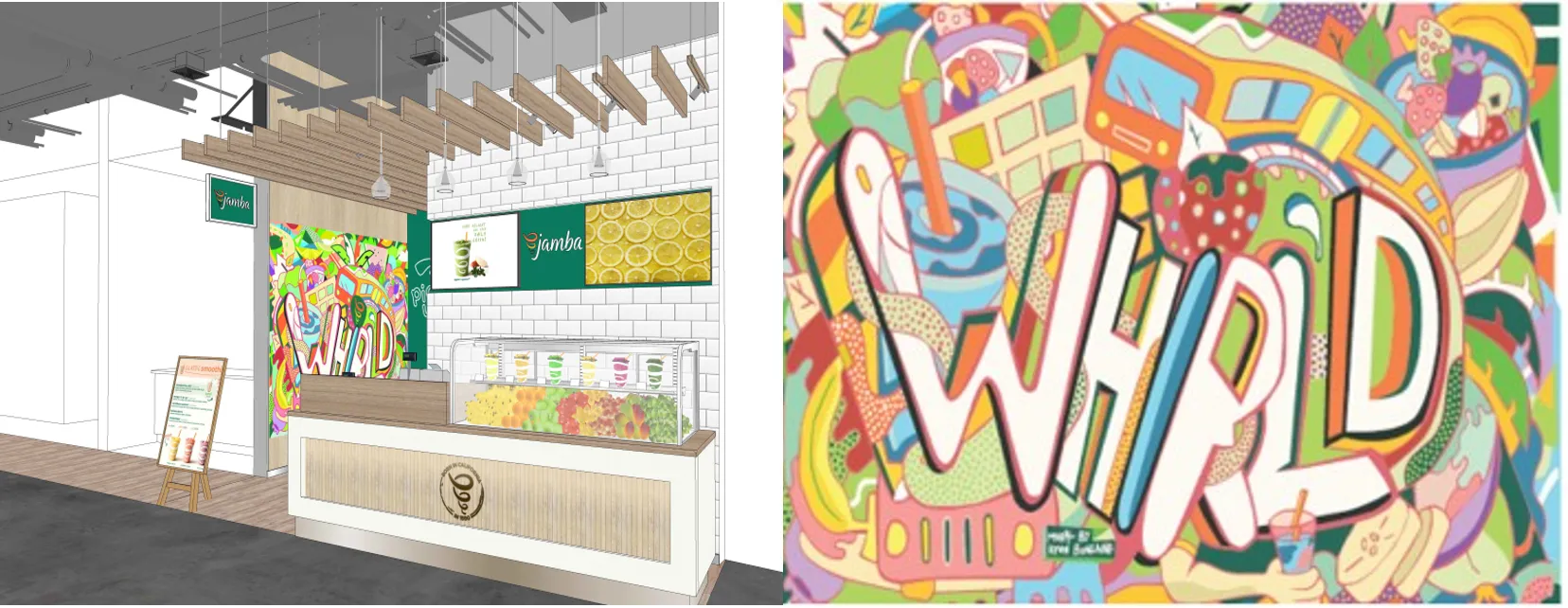 店内は、ビタミンカラーが目を惹くカラフルなミューラル(壁画)が特徴のデザインで、ご来店いただくお客様を明るく元気に迎え入れます。また、ミューラルに大きくあしらわれた「whirl'd」の文字は、“渦巻く”、“ブレンドする”を意味する「Whirled」と「World」を掛け合わせたJamba独自の造語で「パーソナルウェルネスを通じて、より良い世界を創る」という想いが込められております。Jambaのスムージーを通して、ポジティブで元気でカラフルなライフスタイル“Jambaのある生活”をご提案いたします。