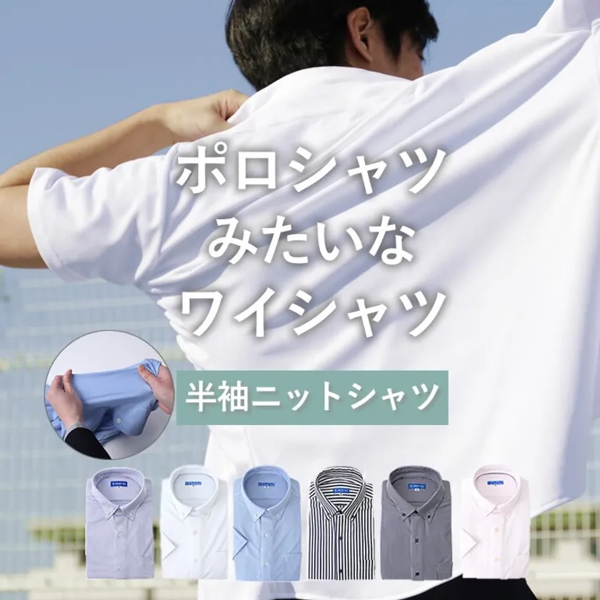 今回販売している「ポロシャツみたいなワイシャツ」は従来の通気性や形態安定性の機能はそのままに伸縮性に優れたニット生地素材を使用したニットシャツになっています。