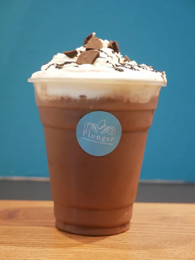 当店で販売しているガトーショコラにも使用している本格的なカカオ72%とカカオ61%のチョコレートをブランドしてミルクとともに混ぜ合わせた夏にピッタリのコールドチョコレートドリンクです。仕上げには特製の生クリームとチョコソース、クラッシュチョコレートをトッピングして、チョコレート専門店らしくどこまでもチョコレートにこだわったドリンクを作りました。店舗から徒歩2~3分の距離にある北条海岸のビーチの夏景色をイメージして、チョコレートの海に浮かぶ白い雲を表現しています。
