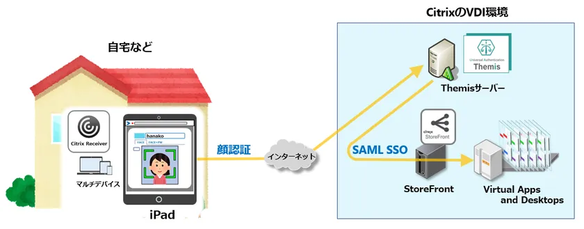Citrix StoreFrontとThemisが連携することにより、例えばiPadで仮想デスクトップ環境にアクセスする場合、複雑なパスワード入力ではなくThemisの顔認証をおこなうだけで仮想デスクトップ環境に安全にアクセスができるようになり、セキュリティを担保しつつ場所や時間にとらわれない柔軟な働き方を可能にします。