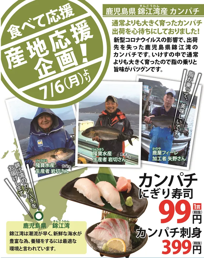 3弾では、鹿児島県・錦江湾でカンパチを養殖する隆寶(りゅうほう)水産と、それを加工する鹿屋フィーレとのコラボ企画としまして、カンパチの刺身・にぎり寿司をお手頃な価格で期間限定販売いたします。
