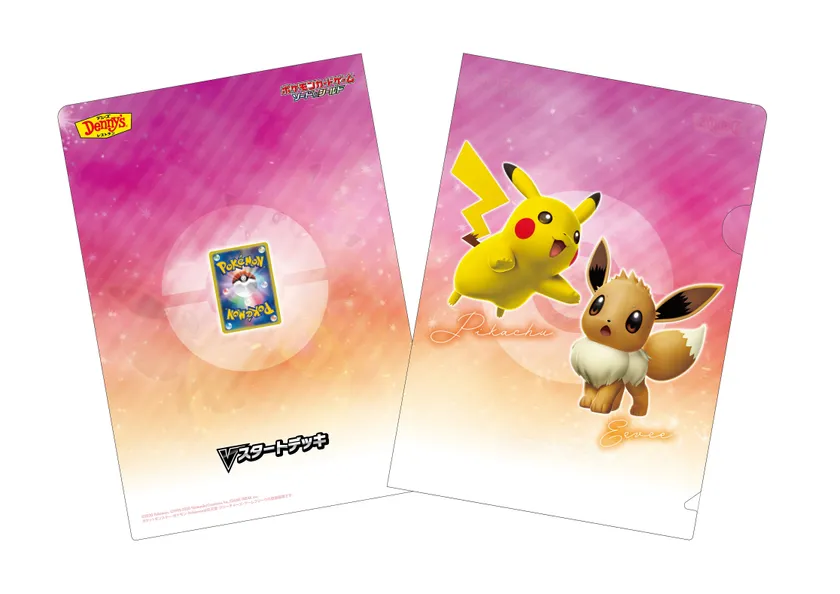 プレゼントは、ピカチュウやイーブイなどのポケモンを可愛くあしらった「デニーズオリジナルA5クリアファイル」2種と、サルノリやヒバニー、メッソンなど、『ポケットモンスター ソード・シールド』に登場するポケモンたちが入った「デニーズセレクトカードパック(全5種のうち1枚入り)※8月1日からプレゼント開始」です。