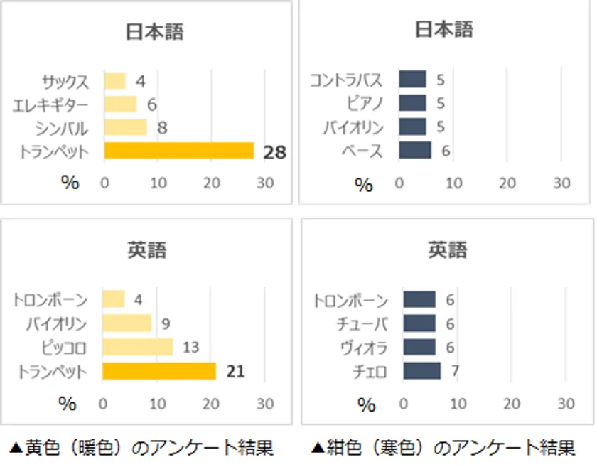 日本語と英語のアンケートを2種類作成し、12色からイメージする楽器を調査。人は色彩や音を過去の経験を元に連想しています。そのため、生活環境や言語による違いがあるのか、日本語話者79名と英語話者45名で比較しました。暖色はトランペットなど高い音の楽器、無彩色はピアノの連想が日本語・英語両方から票を集め、言語による違いはありませんでした。寒色は日本語・英語共に、顕著に連想される特定の楽器はなく、相違点も少ない結果となりました。