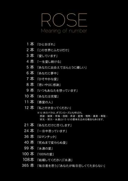 これから告白やプロポーズ、入籍などご検討の方には、このような「○○の日」をきっかけにぜひローズを持って想いを伝えてみてはいかがでしょうか。想いを伝えるきっかけが欲しい方、新たな記念日ができるとしたら覚えやすい日付が良い方にピッタリです。