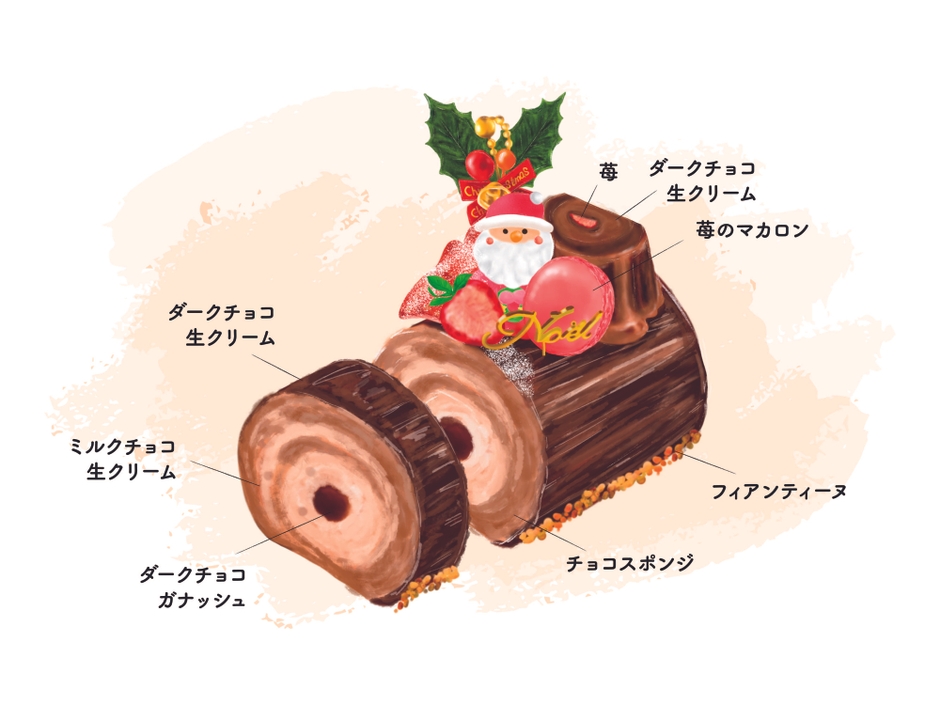 チョコレートを存分に堪能できる、こだわりのブッシュ・ド・ノエル。口どけの良いチョコレートスポンジで丁寧に巻き上げたのは、一度生チョコレートを作ってからクリームでのばしたなめらかなミルクチョコレートクリーム。そして切り株の芯の部分には、さらに濃厚なダークチョコレートの生チョコレートを忍ばせました。デコレーションには、甘さ控えめでビターなダークチョコレートクリーム。内側と外側で異なる2種類のクリームを使い分けることで、一口食べればミルクチョコレートのまろやかな甘さとダークチョコレートの奥深い香りが口いっぱいに広がる、まさにチョコレート好きにはたまらない一品です。