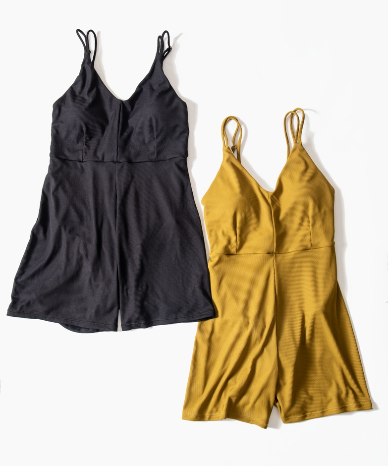 バイカラーのリブセパレートタイプ。素材は光沢のないものを使用しているので、タウンユースでインナーとして使うこともできる。ハイウエストのボトムと背中にデザインを加えたトップは、ヘルシーに着ることができる一枚。
