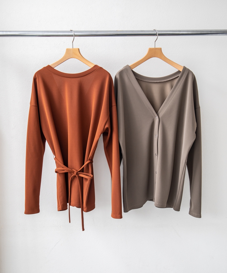前後2WAYで着ることができ、ウエストに付いている紐でシルエットに変化を出すことも可能。カーディガン型のラッシュガードになっており、着脱しやすいのもポイント。落ち着いたアースカラーでの展開なので、一枚で今年らしさを出すことができる。