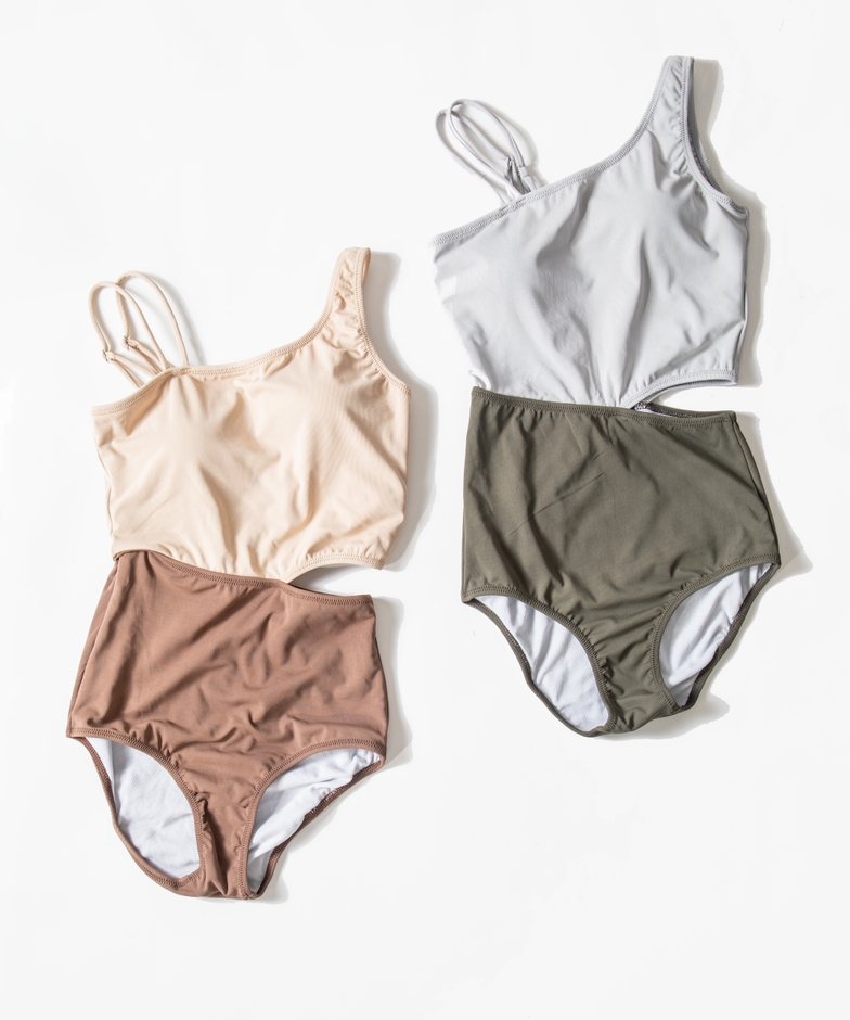 ワンショルダーっぽく見えるが、肩紐を付けているので安心して着ることができる一枚。2色の絶妙な色加減が、大人な印象を与えてくれる。ウエストから肌が少し見えるのもポイント。