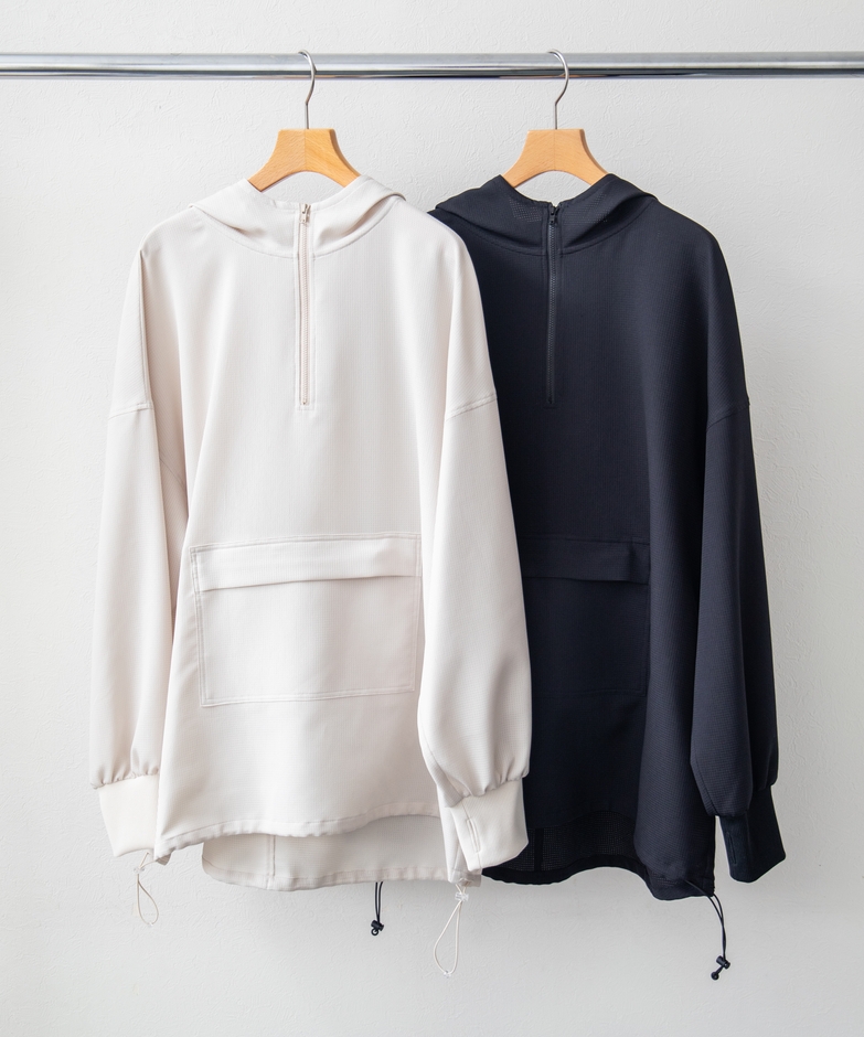 昨年大好評のメッシュ生地を今年はアノラックで再登場。やや長めの丈感は裾のドローストリングを使い、シルエットを楽しむことができる。速乾性もある為、濡れたまま水着の上からの着脱も可能。持ち運びに便利なパッカブルタイプで、この時期活躍が期待できる一枚。