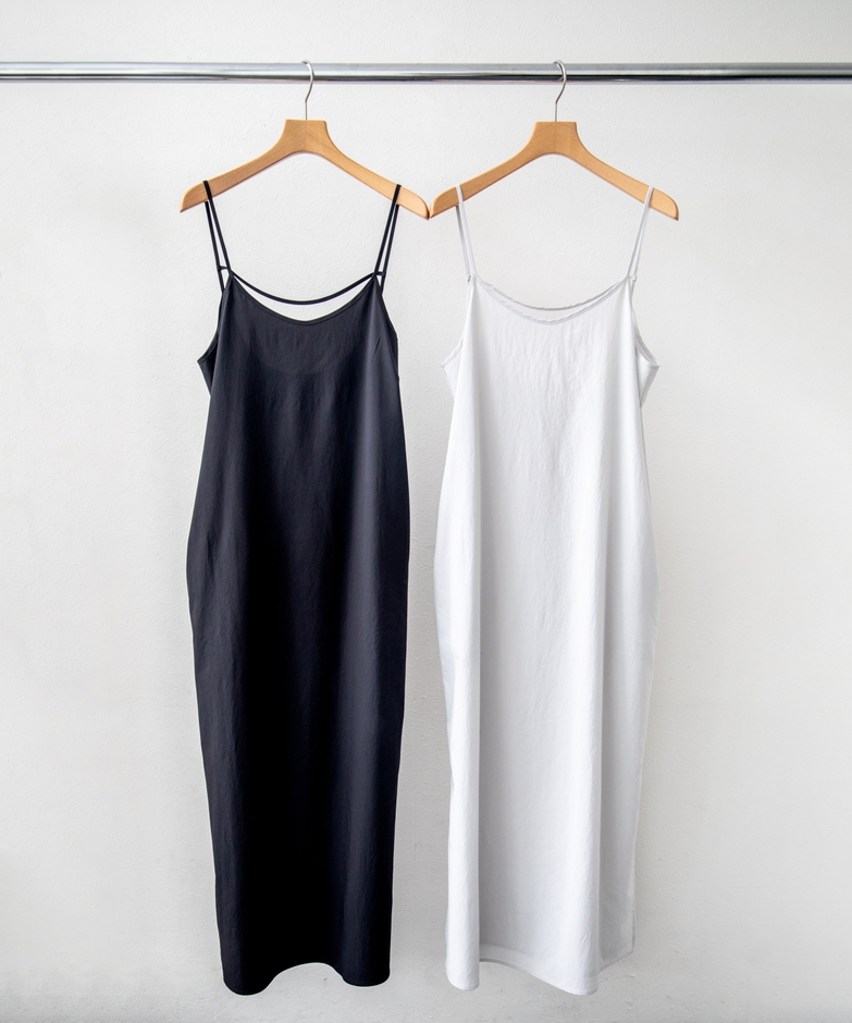 線の細いシルエットが華奢見えを叶えてくれる一枚。速乾性もあり、水着の上からでも着ることができるので、リゾート地でそのまま食事にも行けてしまうカジュアルドレス。背中にデザインがある為、あえて水着のカラーと遊ばせるのもおススメ。