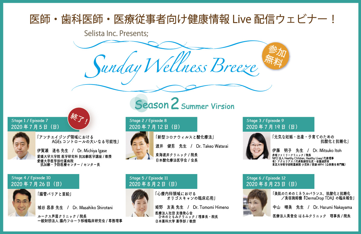 2020年5月17日(日)より、毎週日曜日朝10時から6週連続で、医師・歯科医師・医療従事者向け健康情報Live配信ウェビナー(ウェブセミナー)「Selista Inc. Presents; ~Sunday Wellness Breeze~Season 1(全6回)」を開催して参りました。お陰様で毎回200人近い先生方にご参加頂き、心より感謝申し上げます。