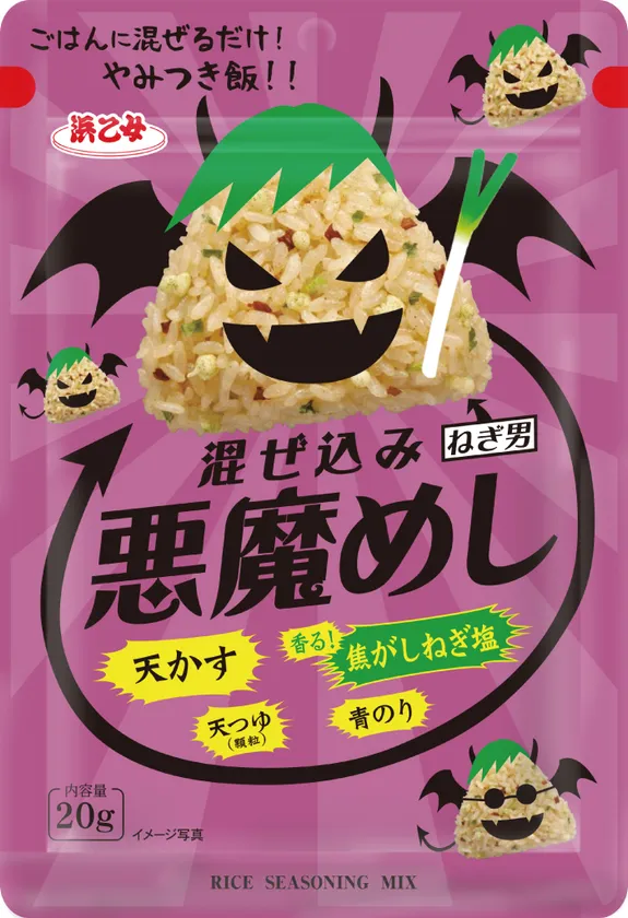 2019年8月に発売後、11か月で約340万個(浜乙女出荷実績)と大ヒットの「混ぜ込み 悪魔めし」。今回はシリーズ第2弾として「混ぜ込み 悪魔めし 焦がしねぎ塩」を発売いたします。サクサク食感の「天かす(あげ玉)」、磯の風味が食欲をそそる「青のり」、どなたにも食べやすい「天つゆ(顆粒)」をベースに、「2種のねぎ(焦がしねぎ、乾燥ねぎ)」の香ばしさと風味、アクセントに「塩(顆粒)」を加えた、混ぜ込みタイプのふりかけです。