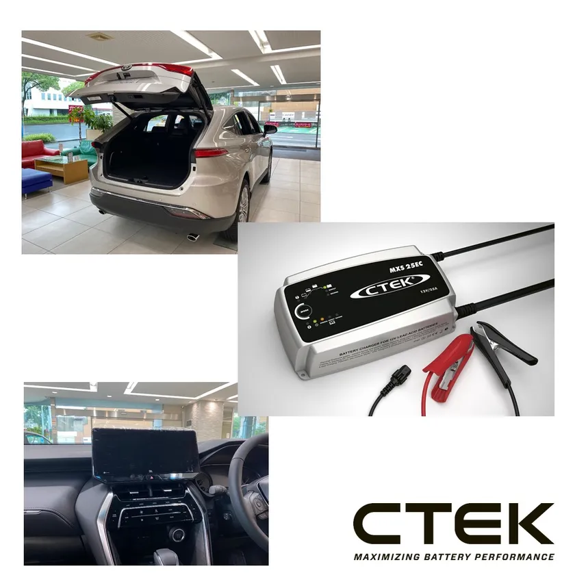 自動車関連用品販売の株式会社TCLが取扱中のCTEK(シーテック)社の高性能バッテリー充電器「MXS25EC」がNTPグループ(名古屋トヨペット、ネッツトヨタ名古屋、ネッツトヨタ中京)様の新型ハリアー展示車両バッテリー充電器に採用され、各店舗にて新型ハリアーのテールゲートの開閉体験やインストゥルメントパネルの操作、各種装備の体験デモンストレーションに活用されていることをお知らせいたします。