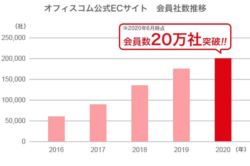 オフィス用家具の製造・販売から内装工事までをトータルに手掛けるオフィスコム株式会社(本社:東京都千代田区、代表取締役社長:室木 剛、以下 オフィスコム)は、2020年6月末日に公式ECサイトの会員社数が20万社を突破したことをお知らせいたします。
