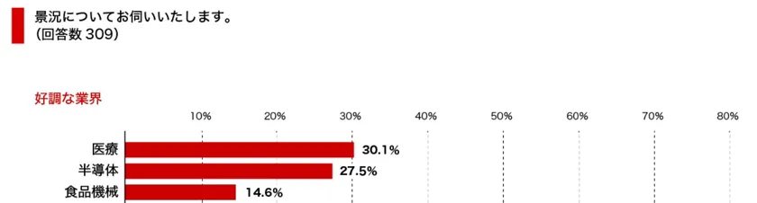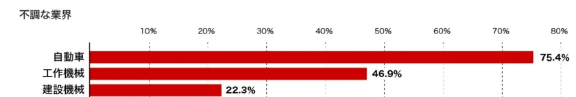自動車業界を不調と答える企業は全体の75%、工作機械も約半数が不調と回答しました。回答企業の多くがこれら産業を主力取引先としており、特定業界依存型の商流の多様化が課題であることがわかります。