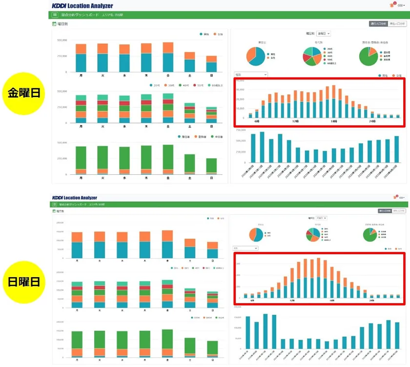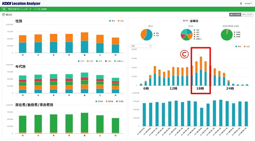 週末のため、帰宅ラッシュに加え飲食や買い物目的の方などが重なる18時前後にピークがくることなどが分析できます。