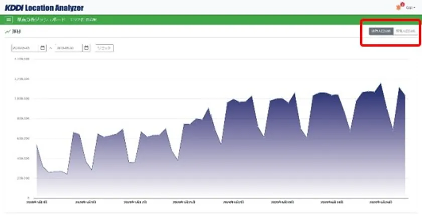 ※右上(赤枠部)で「通行人口」と「滞在人口」の分析結果を切替