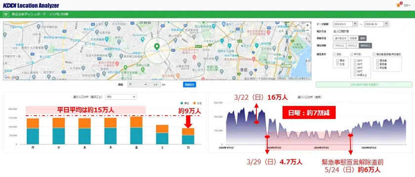 不要不急の外出が求められたコロナ禍で、休日の人通りは大きく影響を受けたと分析できますが、KDDI Location Analyzerの分析では具体的な数字の動きが追えるため、ビジネスの戦略企画の根拠として活用できます。