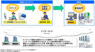 本サービスを導入する事で、スタッフによるPC/携帯ブラウザからの勤怠入力、および電子承認が可能となります。また勤怠データをお使いの給与ソフト等に取り込む事も可能です。