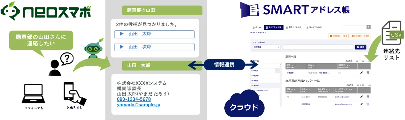 チャットボットサービス【neoスマボ】と、クラウド型アドレス帳サービス【SMARTアドレス帳】の連携により、電話帳に登録された情報から、社員や取引先の連絡先を手軽かつスピーディに検索することが出来るサービスです。