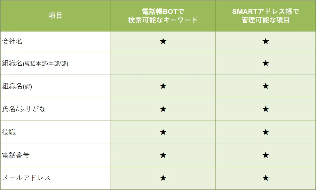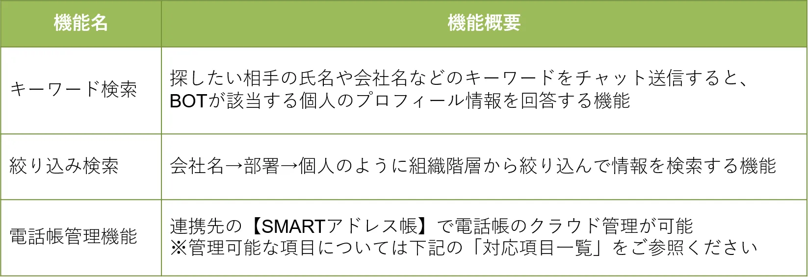 ※「電話帳BOT」のご利用には、別途【SMARTアドレス帳】のお申込み(1ID以上)が必要です。