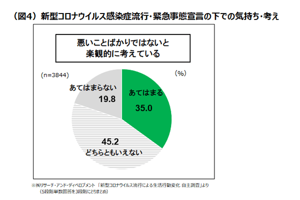 緊急事態宣言下でも「悪いことばかりではない」と考える人は35%。自由回答には、「危機を乗り越えた先に日本の改革が進む」「今までと違う形の“普通の生活”をしなくては」など、この事態をきっかけに、以前に戻るのではなく、新しい生活を作っていくべきとの意見が挙げられている。