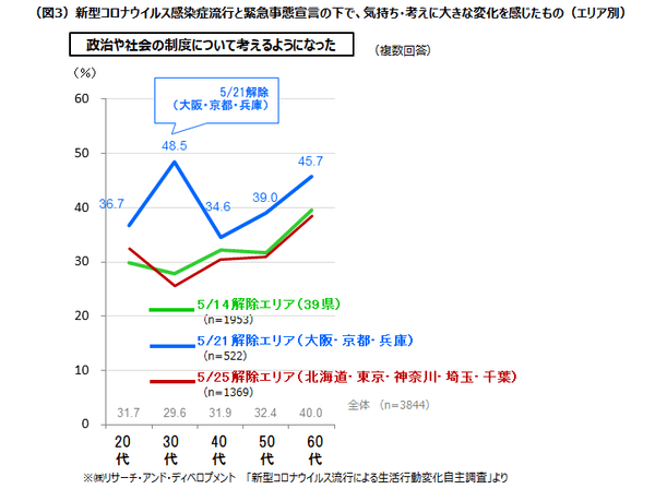 政治への関心の高まりは地域による差が顕著で、全年代で大阪・京都・兵庫エリアの意識変化が他エリアよりも大きい。特に30代ではほぼ5割に達し、全年代中最多であった。