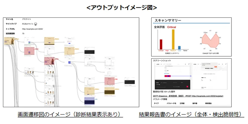 診断結果報告書、画面キャプチャを用いた画面遷移図及び診断結果付き画面遷移図をご提供いたします。その結果、検出箇所の判別が容易になり、監査等で診断結果の共有や説明負荷の低減が可能です。