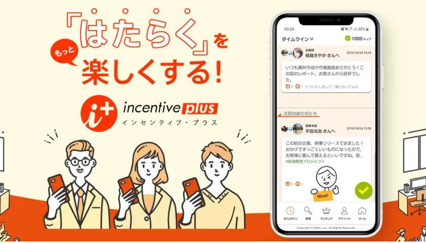 リモートワークの普及により、時間の有効活用やコスト削減などのメリットが取り上げられるなか、従業員同士の繋がりが希薄になるといった新たな課題も出てきています。インセンティブ・プラスは、仲間からの評価・賞賛・感謝を通じて社内コミュニケーションを活発にし、エンゲージメントを高めることができるWebサービスです。また、評価されることで獲得したポイントは、電子クーポンやギフト券などに交換することができるため、報奨制度としても活用されています。